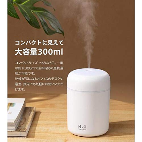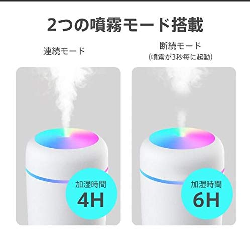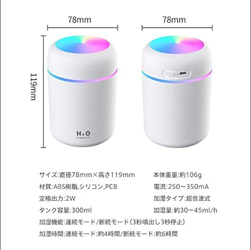 【仕様】 ・サイズ:直径78×高さ119mm ・重量:約106g ・材質:ABS樹脂、シリコン、PCB ・加湿タイプ:超音波式 ・タンク容量:300ml ・加湿量:約30~45ml/h ・加湿機能:連続/ 断続(3秒噴出し3秒停止) ・加湿時間(約):連続4時間/ 断続6時間