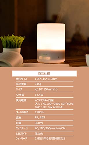 | 商品名 | アロマディフューザー 加湿器 卓上 300ML コンパクト 静音 空焚き防止 次亜塩素酸水対応 2色ライト/7色 |