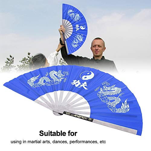 太極拳 双竜功夫扇 太極扇 中国武術 太極拳用 武術扇子 中国風 折り畳み カンフー扇 公演 舞扇子 全3色(青)