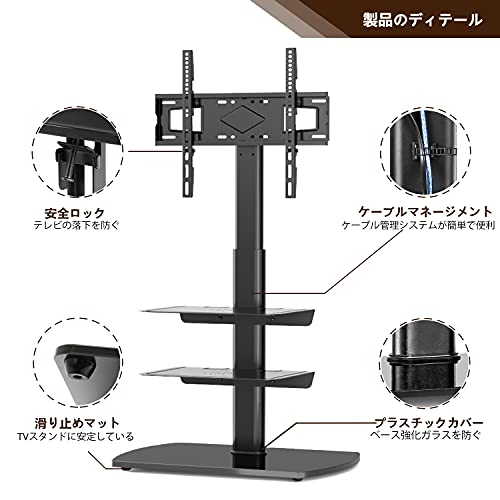 【安全&安定】耐荷重:35kg 頑丈な鉄及び厚い強化ガラスベースで作られています。強化ガラスの衝撃強度、安全性は普通のガラスの何倍もあります。テレビスタンドの底に滑り止めのゴムパッドも付いて、テレビの落下防止するために安全ロックもあり、安定性が優れます。