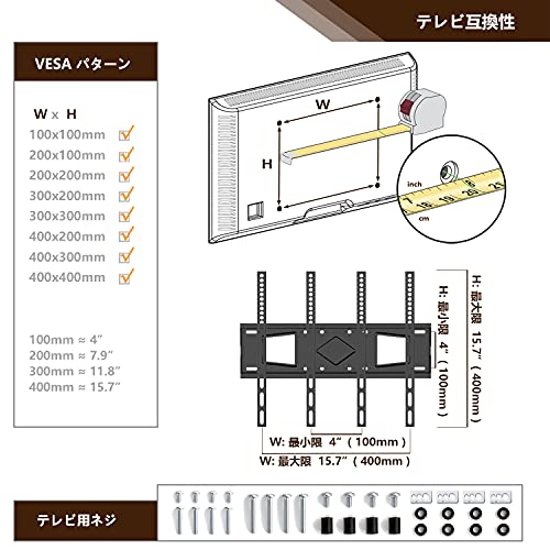 【VESA規格対応】VESA規格(テレビ背面のネジ穴間の距離)は100x100mmから400x400mmまで対応可能です。このテレビ壁寄せスタンドは32 ~ 65インチのテレビとモニターに適応できます。