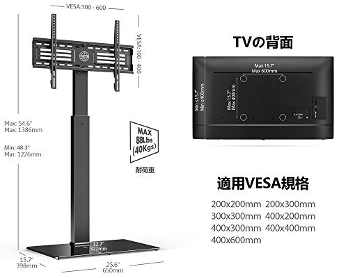【VESA規格対応】汎用性の高いVESA規格(テレビ背面のネジ穴間の距離)対応、最小限は20×20cm、最大限は60×40cmです。当製品が32~65インチのテレビやモニターに適応します。