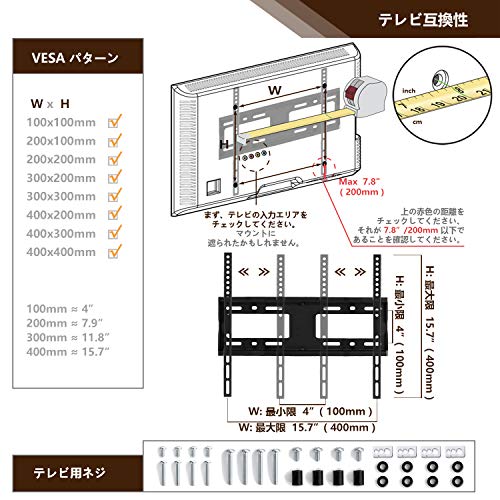 「VESA対応」 このテレビスタンドはほとんどの27 32 37 43 47 50 55インチのテレビに適しています。耐荷重は40kgで、100x100mmから400x400mmまでのVESAが対応可能です(VESAはテレビの背面に取り付けたネジ穴間の距離です)。LCD、LED、平面と曲面のスクリーンテレビも壁掛け可能です。例えば、Vizio Samsung TCL Sharp Haiser ToshibaとLGなどです。