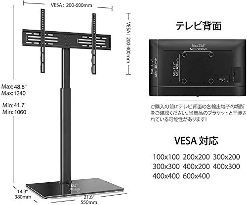 【VESA規格対応】汎用性の高いVESA規格(テレビ背面のネジ穴間の距離)対応、最小限は20×20cm、最大限は60×40cmです。当製品がほとんどの32~60インチのテレビやモニターに適応します。