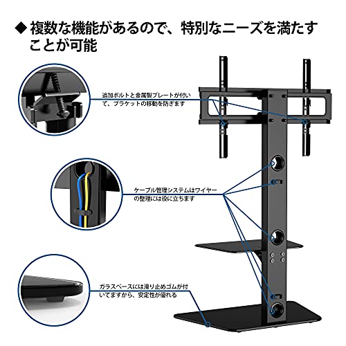 テレビスタンド対応されるVESA規格の最大限は600mmx400mmですけど、50mmx50mm、100mmx100mm、200mmx100mm、300mmx300mmなどにも対応します。VESAはテレビ背面にある取り付けネジ穴間の距離です。鉄と強化ガラスで作られます。耐荷重は40kgで、30-65インチの液晶テレビ(LCD/LED/PLASMA)に適合します。日本語説明書が付属されています。