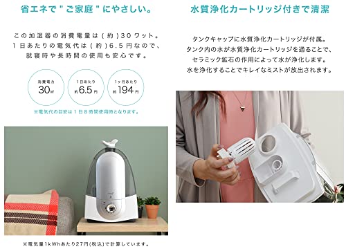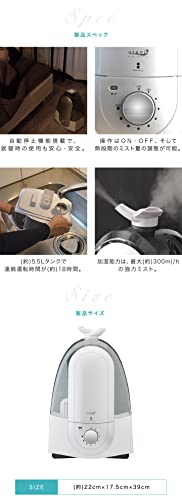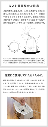 ※こちらの連続運転時間は目安となります。お部屋の温度・湿度によって変動いたします。 加 湿 方 式 超音波式 噴 出 角 度 水平方向360度無段階 / 垂直方向約40度上方固定 重 量 (約)1,400g 材 質 ABS樹脂 / AS樹脂 / 他 電 源 コ ー ド (約)1.8m セット内容付属品 専用洗浄剤 / 洗浄ブラシ / 日本語取扱説明書 / 保証書 特 記 事 項