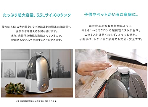 超音波加湿器 uruoi+ うるおいプラス5.5L 商 品 詳 細 カ ラ ー スモーククリア / プレミアムウッド調 電 源 AC100V 50/60Hz 電 気 代 の 目 安 約1円/h 消 費 電 力 (約)30W タ ン ク 容 量 (約)5.5L 加 湿 能 力 最大(約)300ml/h サ イ ズ (約)幅220mm×奥行き175mm×高さ390mm 連続運転時間 (約)16時間(最大加湿時)