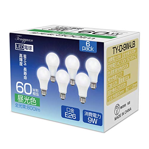 Tengyuan LED電球 E26口金 60W形相当 昼光色 9W 一般電球 E26 800ルーメン A60 密閉形器具対応 断熱材施工器具対応 広配