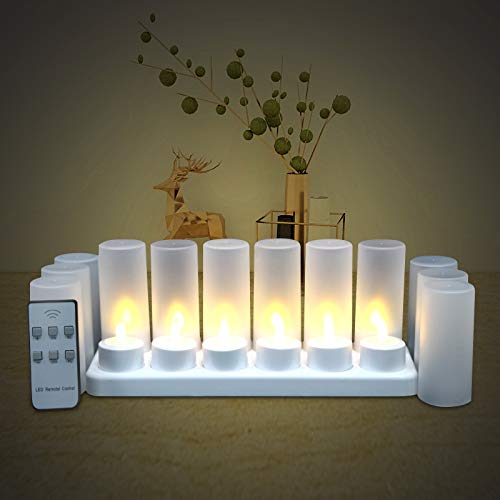 EuroFoneフレームレスキャンドル-12個の充電式LED点滅ティーライト+12個のつや消しカップ-充電ベース付き、リモ