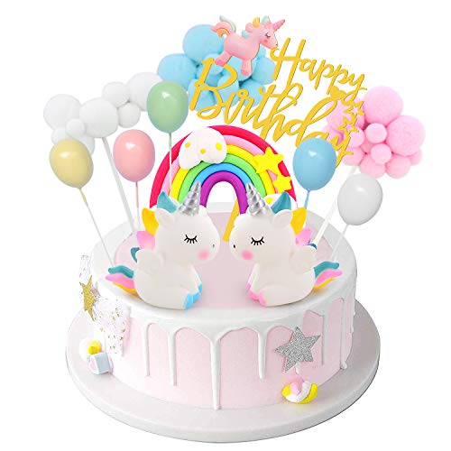 DUOUPA ケーキトッパー 誕生日ケーキ飾り ユニコーン 風船 虹 ケーキ挿入カード(12点セット)