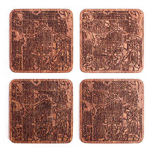カルガリーマップコースター、4枚セット、シティマップ木製コースター、オリジナルデザイン手作りギフト