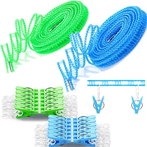 洗濯ロープ 旅行 洗濯物干し ロープ ブルー2本入 約5m 24個クリップ付き 防風 ハンガーを掛けられるスリット付