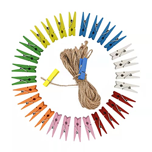 200pcs ミニ丈夫な洗濯はさみジュート麻ひも付き写真クリップ多機能洗濯はさみフォトペーパーペグピンクラフ
