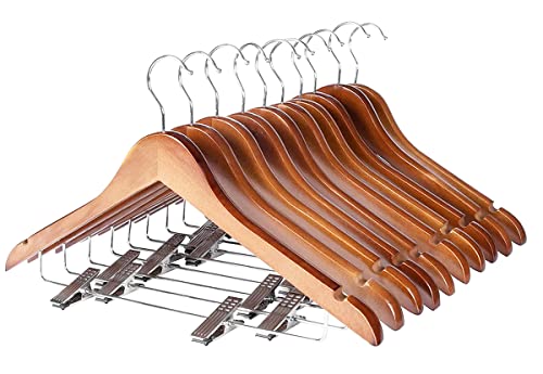 木製スーツハンガー クリップ付きハンガー 10本セット スーツ ジャケット コート用 手作 天然高級木 (茶色 10)