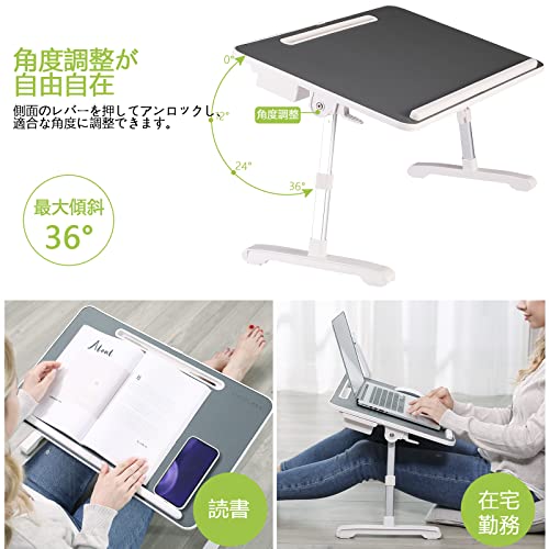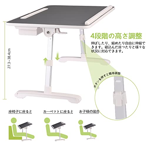【高度・角度調節が自由自在】4段階の高さ(27.3~38.4cm)を調整できまます。角度は0°~36°(12°/段階)調整できます。座椅子での作業はもちろん、ベッドでも使いやすい高さと角度に調整できます。