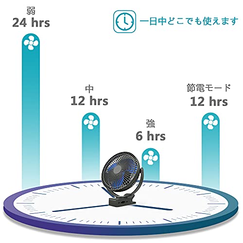 充電式クリップ扇風機 10000mAh電池内蔵 卓上扇風機 直径17cm大型ファン 風量4段階調整 強風 MicroUSB・type-C端子搭