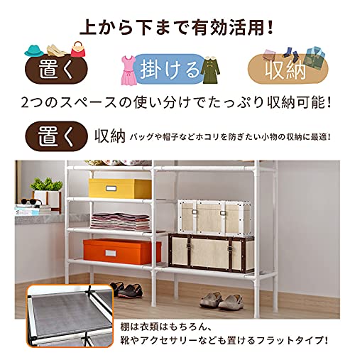 【大容量の収納スペース】2-in-1収納ソリューションと吊り下げ式ロッド洋服ラック。「掛ける収納」「置く収納」をバランスよく取り入れた使い勝手がよく、大量の洋服を上段にたっぷり掛けられで、下部に6ヶ棚を備えたシンプルながらしっかり収納できるハンガーラック。服以外はバッグ、マフラー、帽子、靴、枕、毛布などの収納に、または新居の物置にもすごく便利です!