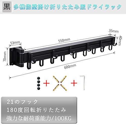 物干しラック 室内 壁付け 物干し 21個左右可動フック 180°回転 折り畳みハンガーラック 服掛けラック タオル