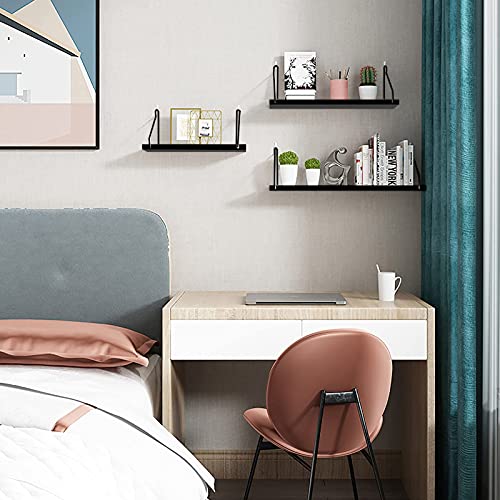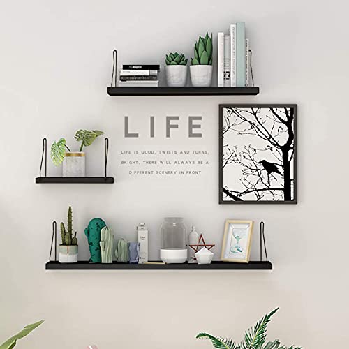 ウォールシェルフ 天然木 壁掛け棚 取付簡単 本棚 DIY 木製 飾り棚 シンプル ワイヤー付け 収納便利 (ブラック,