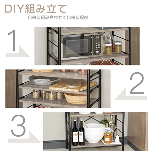 【高さ調節可能シェルフ】オープンシェルフは特別なデザインで、棚に引っ掛けるだけで高さ調節もラックの組み立ても簡単になります。棚は各12cmでポールがありますので、置く物によって段階が12/24/36cm変えます。日々の使用に大変便利なデザインです。