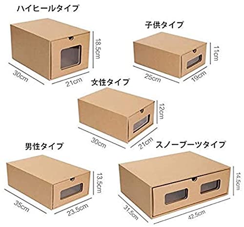 【材質とサイズ】高品質のクラフト紙(透明窓部分はプラスチック)男性用外寸(約)W幅23.5×D奥行35×H高さ13.5cm(1個)、紙の厚さがあり、内寸は少し小さいのでご注意ください。この男性用サイズは女性のフラットシューズや普通の子供靴にも通用していますが、女性のハイヒールのはどうぞハイヒール専用のほうを選びなさい。