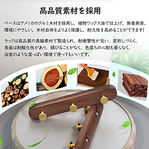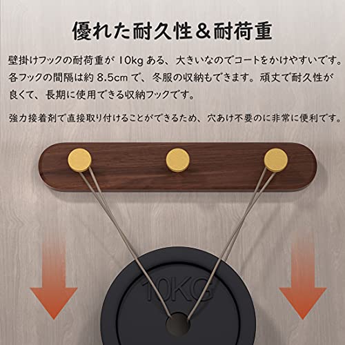 【優れた耐久性&耐荷重】天然木製ベースが植物ワックス油で仕上げ、健康で環境にやさしい。木材自体をよりよく保護し、より耐久性があります。真鍮素材で作ったフックは耐衝撃性良い、変形しづらく、表面は耐酸化性があり、錆びることがなく、色落ちの心配も要らなく、浴室のような湿っぽい環境で使ってもいいです。頑丈で耐久性が良くて、長