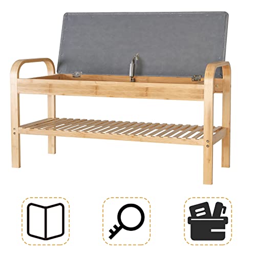 Soges 玄関ベンチ シューズラック 靴 収納 竹製 幅90×奥行33×高さ50cm 可動棚 天板開閉式 玄関収納 玄関 腰掛け