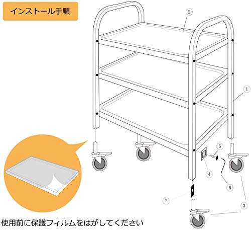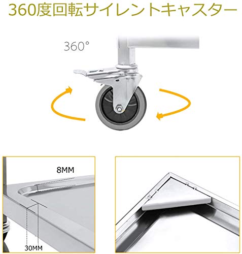 【シンプルで実用】業務用キッチンワゴンは取っ手がついているので移動がしやすくなっています。360度を回転でき、騒音の少ないの高品質のソリッドゴムキャスターが4個付いています。 2つのキャスターはストッパー付き、ロックできます。キャスターにゴムリンクが付き、突き当りを防ぎます。安定性を維持し、日常使用の安全性を確保できます
