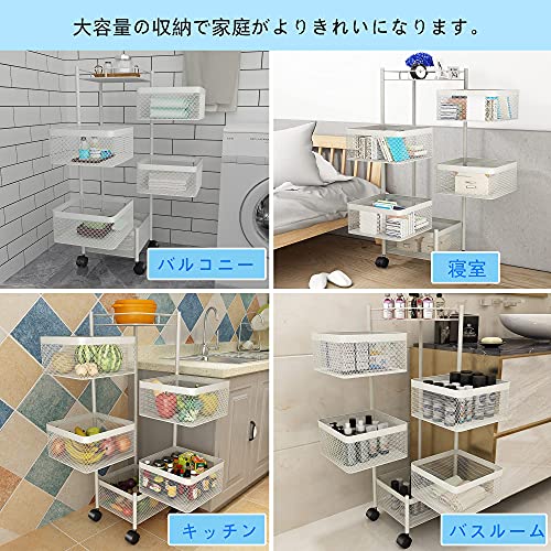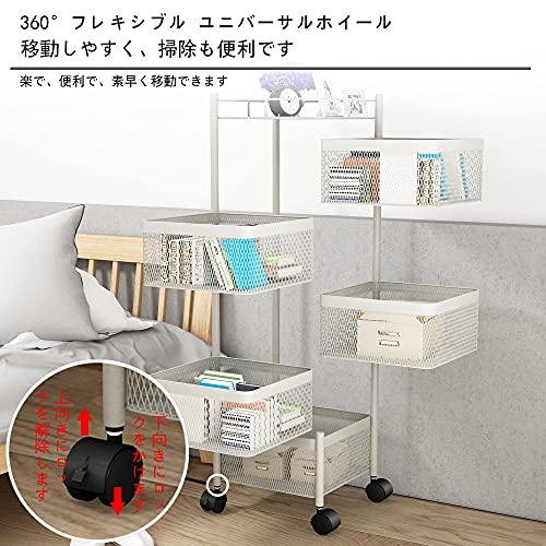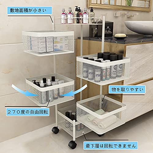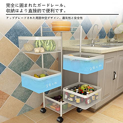 【自由に回転ラック】キッチンワゴンは移動、固定に便利なロック付きキャスター採用、360°自由に回転することもでき、方向を柔軟に変更しますので、清掃もやすくなります。各バスケットは270度自由に回転できます。独特なデザインで収納と物を取るのに非常に便利です。調味料、野菜、果物、台所用品、小型家電製品用の1つの棚で収納ができます。