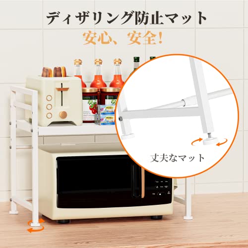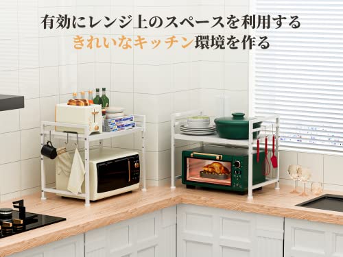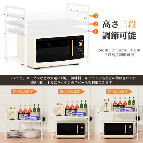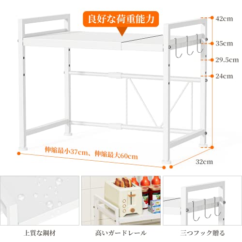BESONTキッチンラック レンジ台 幅伸縮可(37~60cm)高さ3段調節可 三つフック付き (ホワイトM)