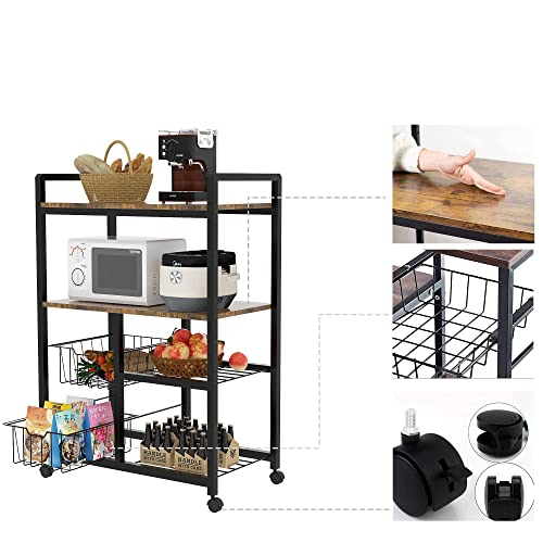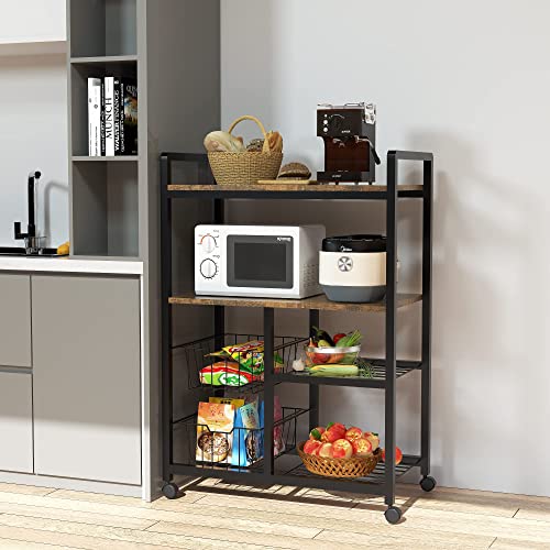 【豊富な収納スペース】サイズ:幅(65)×奥行き(35)×高さ(110)cm。 天板は耐久性に優れ、電子レンジ、ストーブ、やかんなどの厨房機器の収納に最適です。左側の2つの引き出し式バスケットには、散らばりやすい調味料、食品、食器を収納できます!
