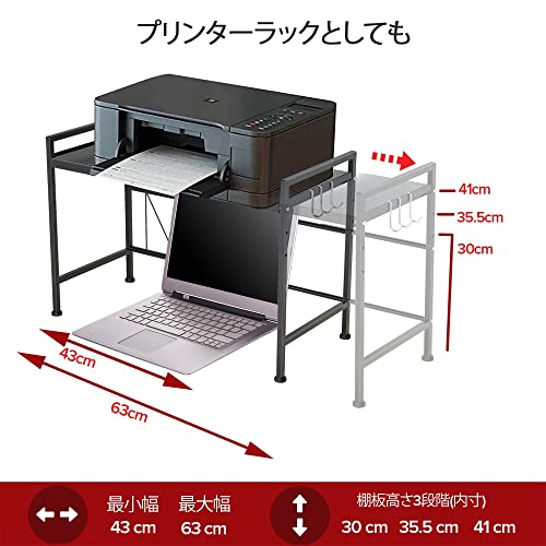 ?【幅、高さ両方調節可】レンジ上ラックは、幅だけでなく棚板の高さも調節が可能です。幅は43cmから63cmの間、棚板の高さは3段階で30cm・35.5cm・41cmに調節ができますので、ご家庭のキッチンサイズに設置でき、限られた空間を無駄なく利用し、便利で快適な使いやすい調理スペースを作れます。