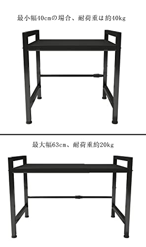 【耐荷重】 ラックの耐荷重は約30-40Kgです(幅により異なります)。最小幅40cmの場合、耐荷重は約40kg、最大幅63cmの場合、約20kgです。普通の小電気製品を棚板の上に置いて、棚板の変形や壊れ等の心配なくて安定です。