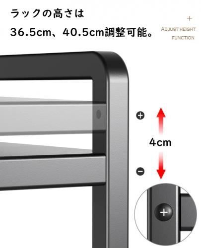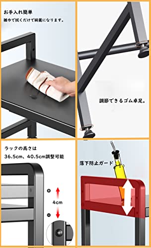 【幅伸縮式・2段式】ラックの高さは36.5cm、40.5cmの2段階に調整可能で、更に、収縮式を採用したため、幅は40cm~63 cmの間で無段階にご調節でき、各サイズの電子レンジやオーブン等の小家電に適用し、キッチン用品をまとめて収納でき、省スペースです。