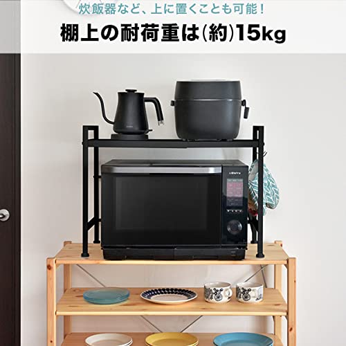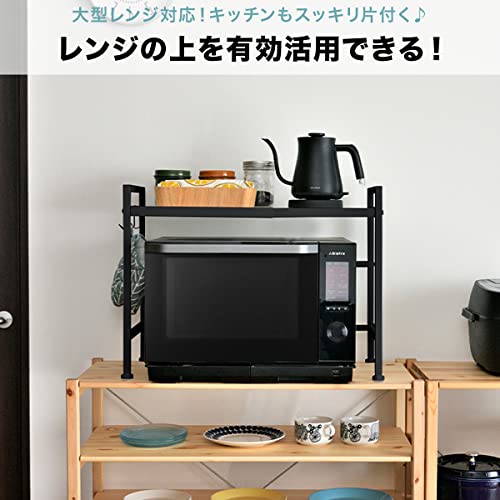 ?【「上に」置けて見た目スッキリ♪】 レンジ横などに置いていたケトルや小物たち。このラックがあればレンジの上に置けるので、キッチンスペースに余裕が生まれます。 ?【背の高い調理器具にも対応】 棚の高さは3段階調節することができます。棚下の高さは最大で(約)40.5cmにできるので、大型レンジや背の高い調理器具などを収納することができます。
