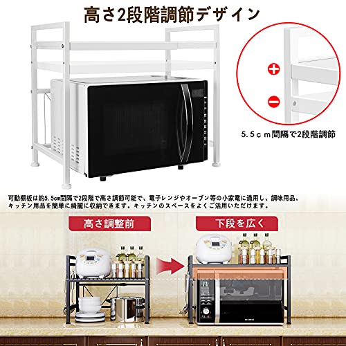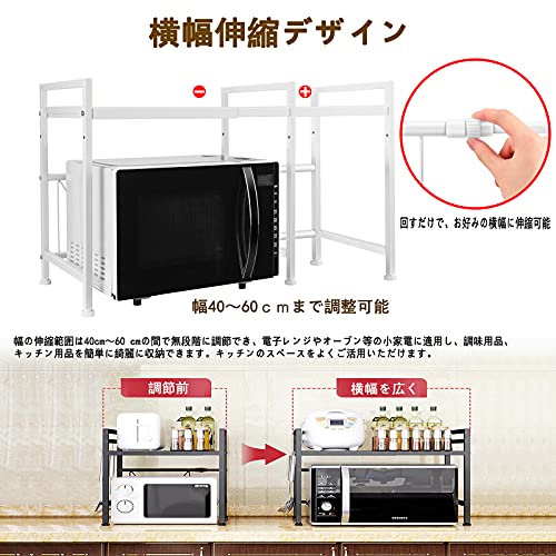 ?【高さ2段階調節可・幅伸縮式】収納ラックの幅の伸縮範囲は40cm~60 cmの間で無段階に調節でき、可動棚板は約5.5cm間隔で2段階で高さ調節可能で、使い勝手がとても良いです。電子レンジやオーブン等の小家電に適用し、調味用品、キッチン用品を簡単に綺麗に収納できます。キッチンのスペースをよくご活用いただけます。