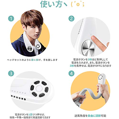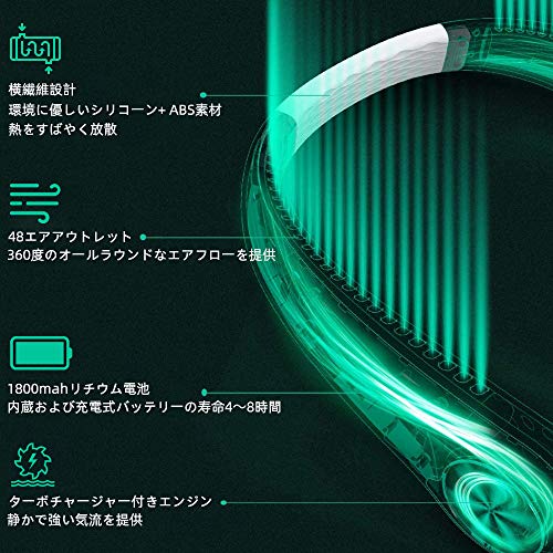【2021新登場首からかける携帯扇風機】2021年最新モードmini ネック冷却クーラー。改良されたポータブル扇風機です。人間工学デザイン、また高密度シリコン素材を採用して、わずか220gになり、長時間装着してもねばねばしません、首周りで48個吹き出し口を採用しており製品内部は空気が急速流通してるので逆に首と接触部分は涼しい感触があり、快適な装着体験を与えます。ハンズフリーのデザインをヘッドフォンの形に変え、手を自由にして他のことをしてください