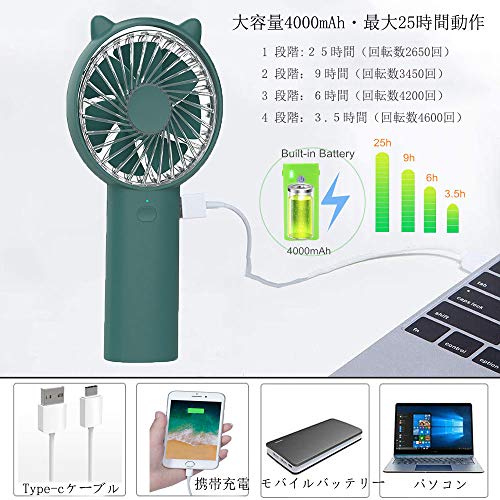 ?【大容量4000mAh・最大25時間動作・携帯充電可】ハンディファンは4000mAhの18650リチウム電池を内蔵しており、フル充電の場合に、1 段階で最大25時間駆動できます。ハンディ扇風機への駆動時間は弱モード/25時間・中モード/9時間・強モード/6時間・超強モード/3.5