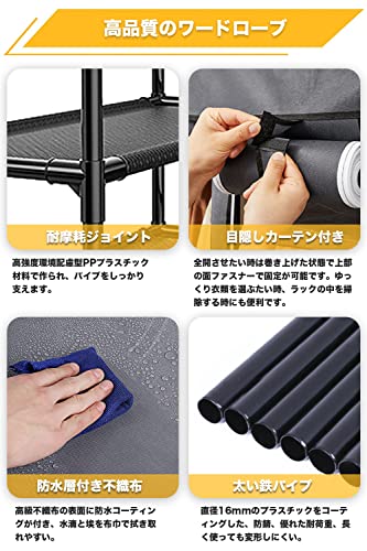 【抜群通気性があるワードローブ カバー付き】豊富な収納スペースがあり、衣類などをまるごと収納出来、カバーで隠せばお部屋がすっきりします。隠しカーテンは不織布なので通気性が良いです。また、カバーをする事でホコリや日焼けから衣類を守ります。