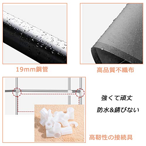 【素材】:頑丈な構造のポータブルクローゼット,直径19mmの太いスチールパイプと厚い不織布と強化プラスチックの接続口で構成されます。頑丈でながら長くお持ちできます、衣類や日用品を楽に収納することができます。