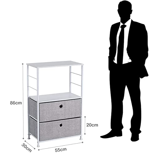 【製品情報】外寸(約)幅55×奥行30×高さ86cm (1)天板:MDF (2)フレーム:スチール (3)ボックス生地:ポリエステル (5)仕様:2段2箱 (6)取出し色:ライトグレー
