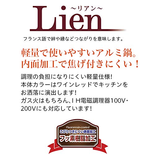 調理の負担になりにくい軽量仕様!本体カラーはワインレッドでキッチンをお洒落に演出します!ガス火はもちろん、I H電磁調理器100V・200Vにも対応しています!