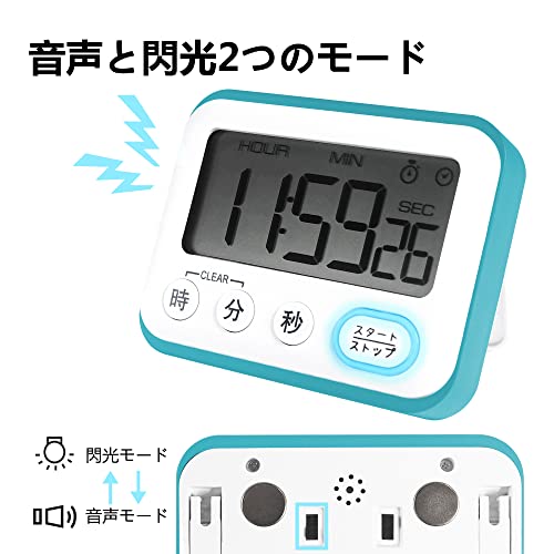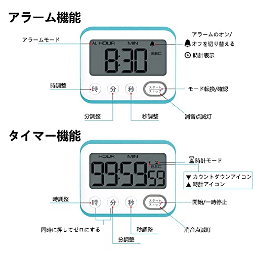 【さまざま機能】:アラーム機能、クロック機能(12/24時間表示切替)、タイマー機能(カウントアップ/カウントダウン)、4キー、トーンがあり、フラッシュが付きます、本体裏マグネット付き、置き掛け兼用(自立スタンド内蔵)。 スタート / ストップキーを押して3つのモードを自由に切り替えることができます。1回押すとアラームモードに、3秒長押しするとカウントアップモードに切り替わります。