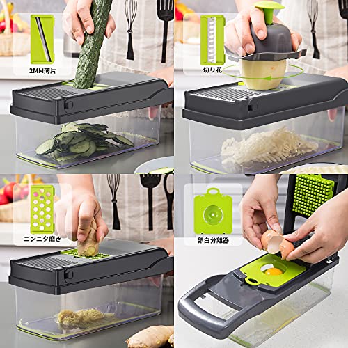 多機能スライサー:2mm薄切りプレート(スライス)、2mmフィラメント刃、3mm太フィラメント刃、波状スライス刃、1111mmスライスを切る、66mm小さな角切り、卵白分離器、粉砕刃は、1分以内に異なる野菜切断要件を満たすことができます。簡単に食べ物を理想的な形や大きさに切ることができます。