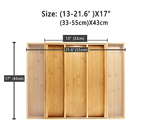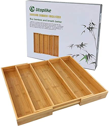 スライド式カトラリーケースのサイズが(幅33-55)x長さ43x高さ5cm。ケースが5つの空間を仕切り、収納力が高いです。引き出しと卓上をきれいにします。