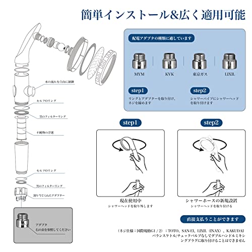 ?【極細水流】このシャワーヘットは精密の散水板を採用しており、シャワー穴の穴径は0.3mmで、水流は幅広くて細密で、まるでシルクのような、肌に優しいに感じられるに仕上げります。Spa入浴体験をお楽しめます。シャワーヘッドは浄水機能があり、フィルターも内蔵され、水中の塩素と不純物を有効に除去できます。【ご注意??】:1.コットンフィルターの設置方向にご注意ください。2. 3~4っか月にコットンフィルターを取り替えてください。