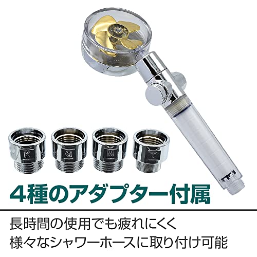 ヘッドは上下60°・左右360°に回転するので、お好みの角度に調節可能です。アダプターが4種付属しますので、様々なシャワーホースに取り付けることができます。