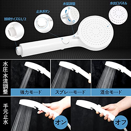 【シャワーヘッドの使い易さ】(1)本体はABS高級プラスチックを採用し、手触り感がよく、家族の健康を守るや環境にやさしい素材です。(2)角度調節自由自在に!シャワーフック付属です。(3)手元止水機能が髪を洗ったり、洗顔したりと、ちょっと止めたい時に便利です、また、軽量で片手で操作でき、長時間持ちにも疲れません。(4)三つモードがあって、子供、老人に適する柔らかな水あたりのスプレーモード;大人に適する一日疲労解消、気分爽快になるの混合モード;浴室清掃に水圧強いの強力モード、3段階の高圧にすると、お掃除などで困ることはありません。手元で自由調整できます。(5)ネジサイズG1/2、またアダプター付き、ほとんどのホースメーカ