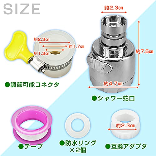 【セット内容】蛇口用シャワーヘッド×1点 調節可能コネクタ×1点 互換アダプタ×1個 防水リング×2個 テープ×1巻 【サイズ(約)】ヘッド:直径4.7cm×全長7.5cm、取付部分:直径2.3cm