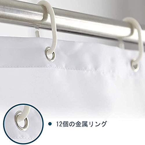 サイズ:幅180x丈180cm 素材:100%ポリエステル 仕様:防水防カビ パッケージ内容:本体1+カーテンリング12